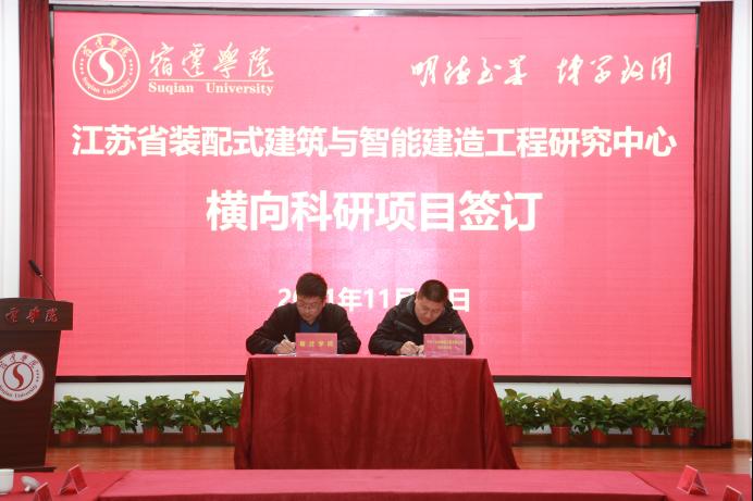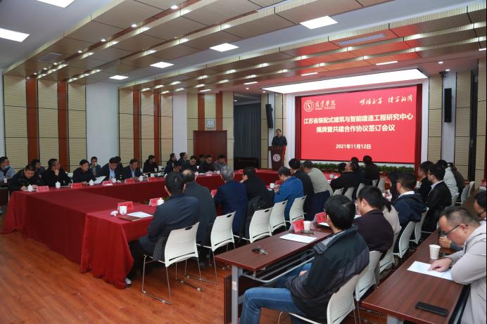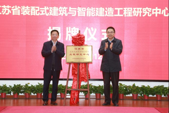 2021年11月12日下午,江苏省装配式建筑与智能建造工程研究中心揭牌暨共建合作协议签订会议在校新图书馆学术报告厅举行。校党委常委、副校长潘志明教授,宿迁市工业和信息化局机关党委书记、一级调研员张宝林,宿迁市发展和改革委员会党组成员、三级调研员王展出席活动,并为“江苏省装配式建筑与智能建造工程研究中心”揭牌。会议由建筑工程学院副院长、工程研究中心主任朱方之主持。