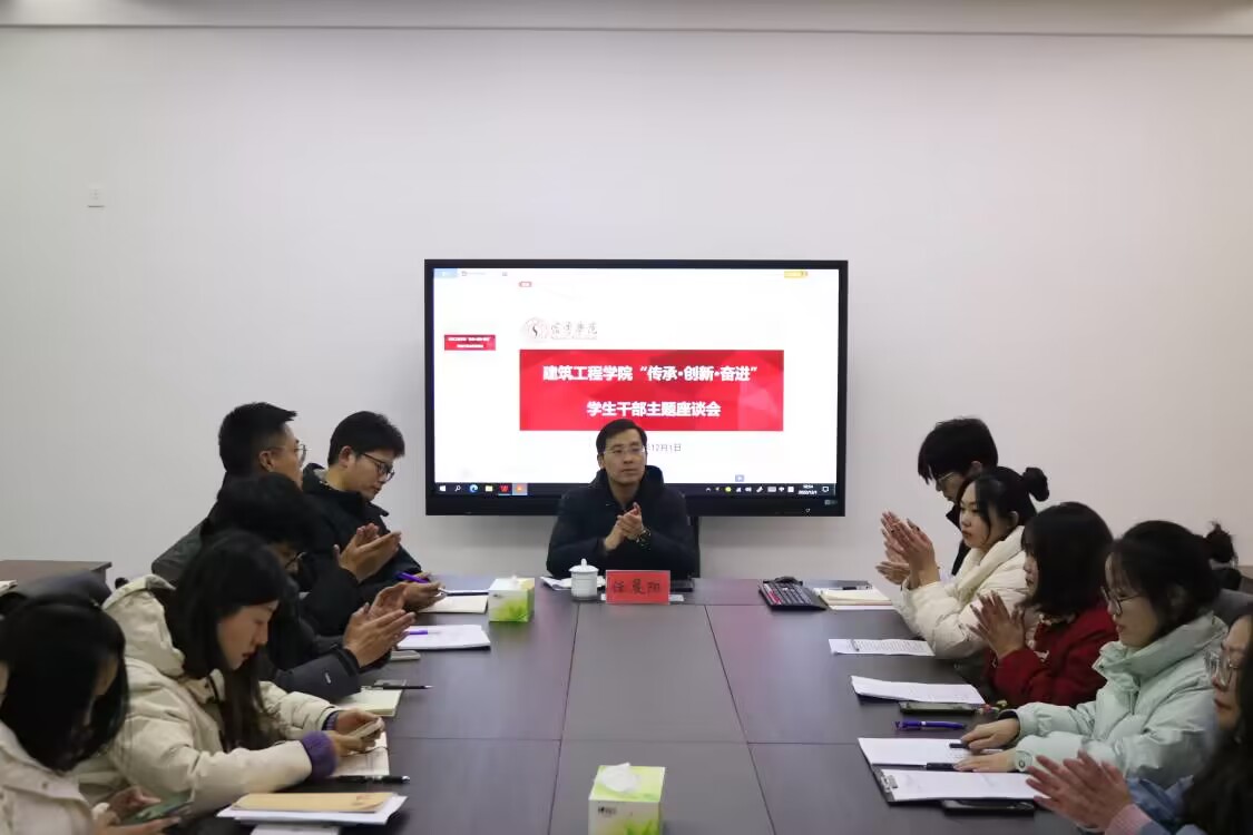 为进一步发挥学生干部先锋模范带头作用,坚持立德育人根本任务,扎实推进学院各项重点学生工作,提升学生干部服务意识,保障学生工作的稳步进行,12月1日晚,建筑工程学院在院办E209召开主题为“传承·创新·奋进”的学生干部座谈会,院党委副书记任晨阳,全体辅导员老师,校级组织代表(建工学子),学院各学生组织主要学生干部出席此次座谈会,会议由学工办高政老师主持。