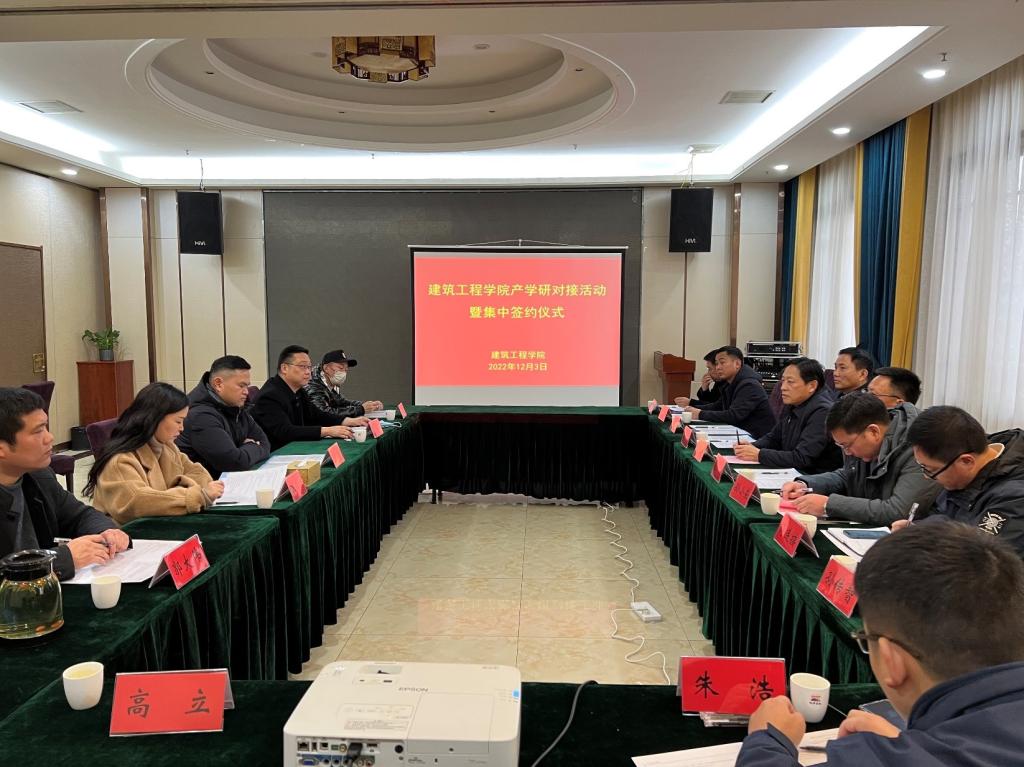 2022年12月3日下午,为深入实施宿迁学院“三联三融”工程,切实推进产学研深度融合。建筑工程学院特邀宿迁恒丰新型建材有限公司、江苏天园项目管理集团有限公司、江苏德广建筑工程有限公司、宿迁华美新材料有限公司、江苏恒聿建设工程有限公司等5家公司领导共同召开了产学研对接活动暨集中签约仪式。