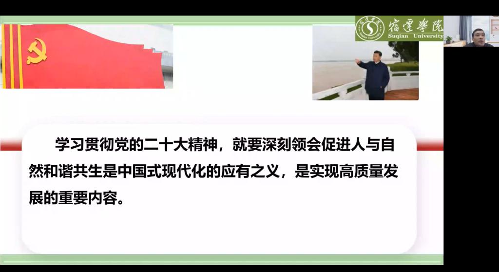 郭照冰副校长指出,中国式现代化是党的二十大报告的一个重大亮点,也是一个重大创新点。他从中国式现代化五大特征之一的“人与自然和谐共生的现代化”为切入口,围绕自然观、发展观、系统观、民生观四个基本遵循进行宣讲报告。并给出了围绕生态文明建设的中国方案,一是加快构建生态文明体系;二是坚持不懈推动绿色低碳发展;三是深入打好污染防治攻坚战;四是保护与修复双管齐下;五是打好实现碳达峰、碳中和这场硬仗;六是积极参与全球环境的治理。他强调,学习贯彻党的二十大精神,就要深刻领会促进人与自然和谐共生是中国的现代化的应有之义,是实现高质量发展的主要内容。坚持把学习贯彻党的二十大精神同学院专业紧密结合起来,同本职工作紧密结合起来,将党的二十大精神融入工作和日常,推动党的二十大精神见行见效。