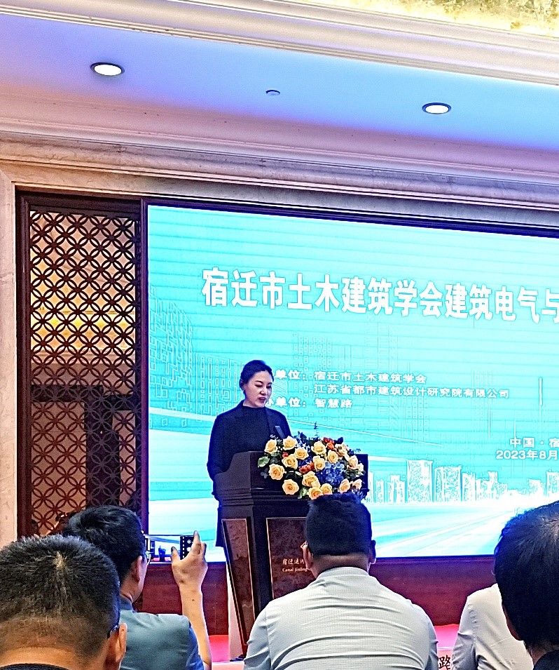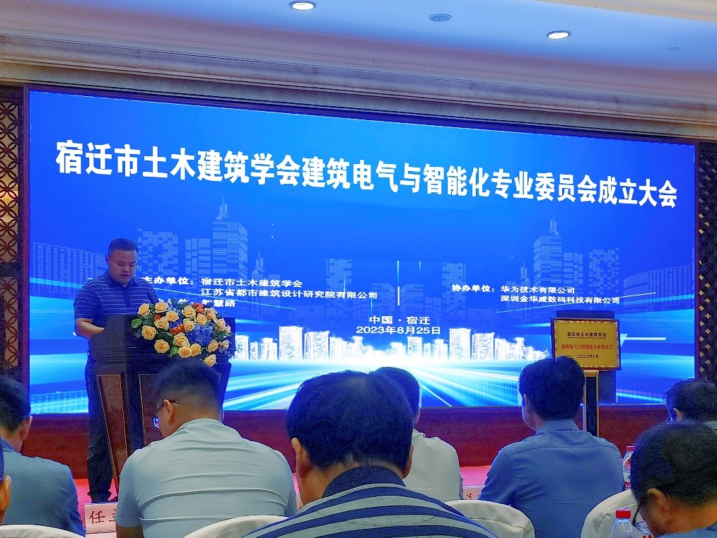 2023年8月25日,宿迁市土木建筑学会建筑电气与智能化专业委员会成立大会在骆马湖畔顺利召开。江苏省土木建筑学会建筑电气专委会副主任委员李冬梅、宿迁市科学协会副主席朱虎等领导出席会议并致辞。淮安市建筑电气与智能化专委会、宿迁学院建筑工程学院、宿迁市土木建筑学会、江苏省都市建筑设计研究院有限公司等单位的近80位代表参加会议。会议由宿迁市土木建筑学会秘书长左工主持。