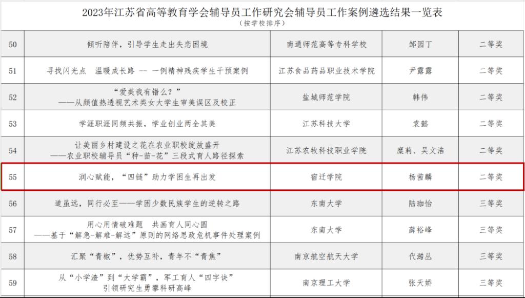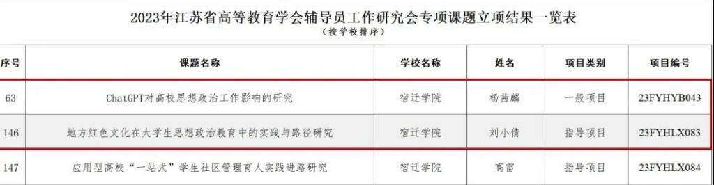 日前,江苏省高等教育学会公布2023年辅导员工作研究委员会辅导员工作案例遴选和专项课题立项结果。建筑工程学院辅导员杨茜麟老师撰写的《润心赋能,“四链”助力学困生再出发》荣获江苏省辅导员工作案例评选二等奖,申报的《ChatGPT对高校思想政治工作影响的研究》课题获一般项目立项,刘小倩老师申报的《地方红色文化在大学生思想政治教育中的实践与路径研究》课题获指导项目立项。