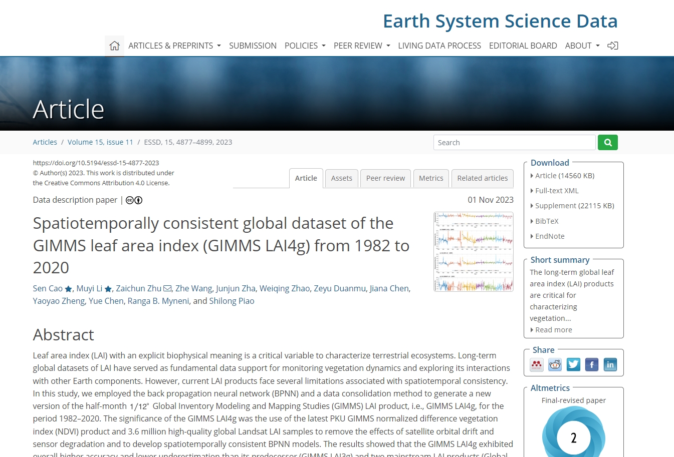 根据ESI(Essential Science Indicators,基本科学指标数据库)5月公布的最新统计数据,建筑工程学院李慕义博士(共同一作)发表在国际地球科学领域顶级期刊《EarthSystemScienceData》(中科院一区Top,IF=11.4)上的论文“Spatiotemporally consistent global dataset of the GIMMS leaf area index (GIMMS LAI4g) from 1982 to 2020”(2023,15(11): 4877-4899)入选ESI热点论文(Top 0.1% Hot Paper)。论文重点关注并解决了由于卫星轨道漂移和传感器退化等原因导致的全球LAI时序产品中的不确定性问题。北京大学为论文第一署名单位,中国科学院院士、北京大学副校长朴世龙为论文共同作者。