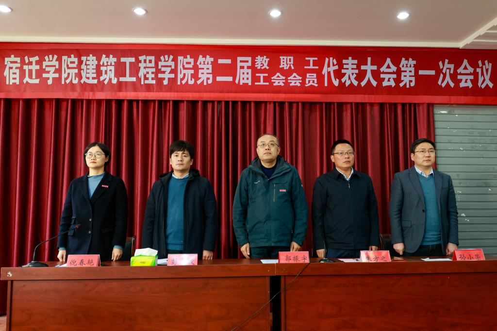 大会在庄严的国歌声中拉开序幕。会议上全体教职工审议并通过《学院工作报告》和《分工会工作报告》,并选举出宿迁学院建筑工程学院第二届教职工大会代表、宿迁学院第二届教职工代表大会代表、宿迁学院第二届工会会员代表大会代表及建筑工程学院第二届工会委员。