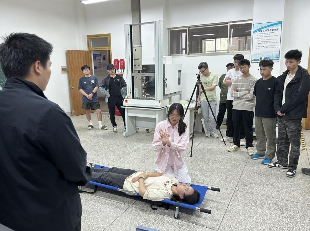 下午的活动主要围绕地震避险救援应急演练展开,活动首先进行地震避险救援知识讲解和应急演练要求说明。当地震模拟警报响起,实验楼师生迅速实施“黄金三角区”避险法,利用课桌、承重墙进行紧急防护。震波暂停后,参演人员用书本护头,沿预定路线快速转移至应急避难广场,全程耗时仅2分钟。活动还针对地震中人员伤亡等突发状况进行了现场救援,并运用担架固定技术转移伤员。我校红十字会志愿者现场开展了心肺复苏、止血包扎等急救操作演练。