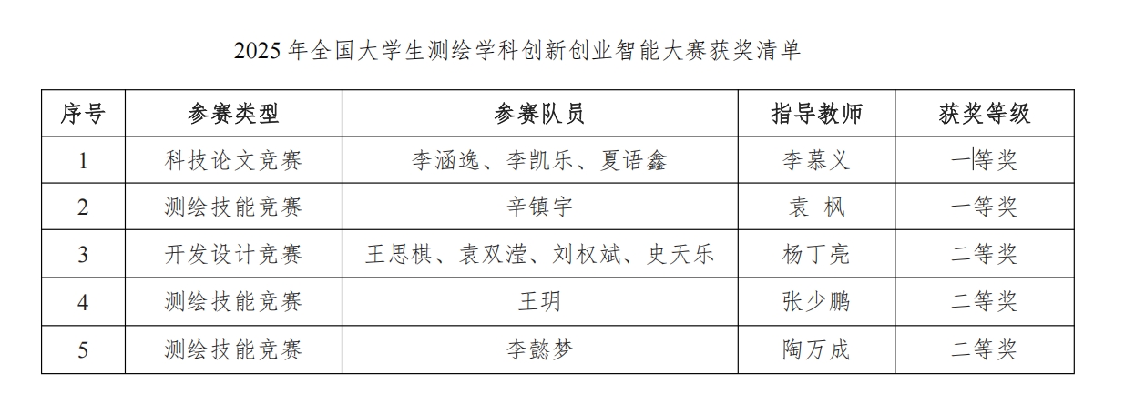 近日,由中国测绘学会教育工作委员会主办、内蒙古科技大学承办的2025年全国大学生测绘学科创新创业智能大赛顺利闭幕。大赛共设置三大赛道,包括测绘技能竞赛、开发设计竞赛和科技论文竞赛。在建筑工程学院测绘工程系李慕义、袁枫、杨丁亮、张少鹏和陶万成等教师的指导下,我院学子荣获一等奖2项、二等奖3项的优秀成绩。其中,李涵逸、李凯乐、夏语鑫同学的论文《中国30mLandsat叶面积指数产品(LAI)生产研究》在科技论文竞赛中荣获一等奖;辛镇宇同学在测绘技能竞赛(测绘程序设计比赛专业组)中荣获一等奖。具体获奖信息见下表。