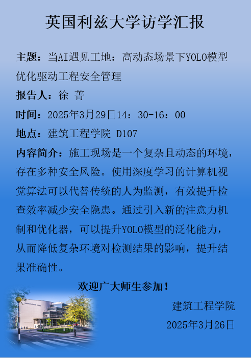 2024年1月至2025年1月,建筑工管学院工程管理系徐菁老师作为访问学者前往英国利兹大学。为分享国际前沿研究成果与教学经验,学院举办专题讲座,由徐菁老师介绍英国高等教育模式、工程管理学科发展动态及访学收获。