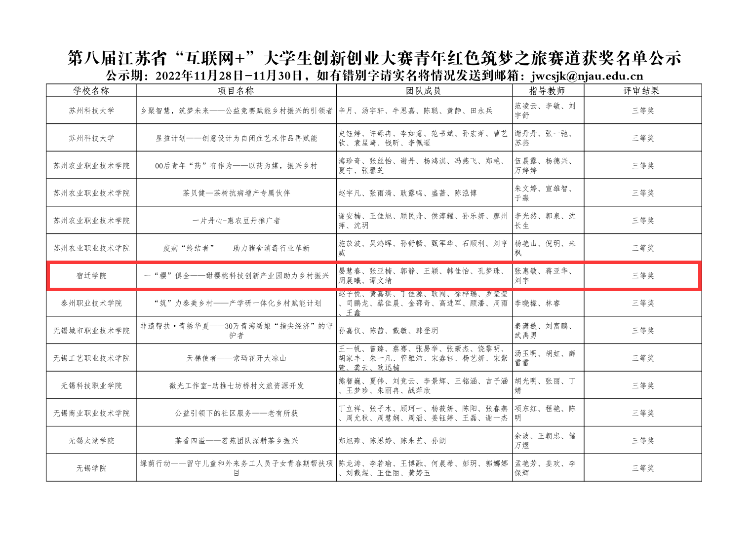 近日,由省教育厅、省委统战部、省委网信办等部门共同主办的第八届中国国际“互联网+”大学生创新创业大赛江苏省选拔赛暨第十一届江苏省大学生创新创业大赛成绩揭晓,由我院张惠敏、蒋亚华、刘宇三位老师指导,2020级晏慧春同学主持,韩佳怡、张亚楠、郭静、王颖、孔梦珠、周晨曦、谭文靖七位同学参与完成的项目《一“樱”俱全——甜樱桃科技创新产业园助力乡村振兴》,获得了红旅赛道省赛三等奖!