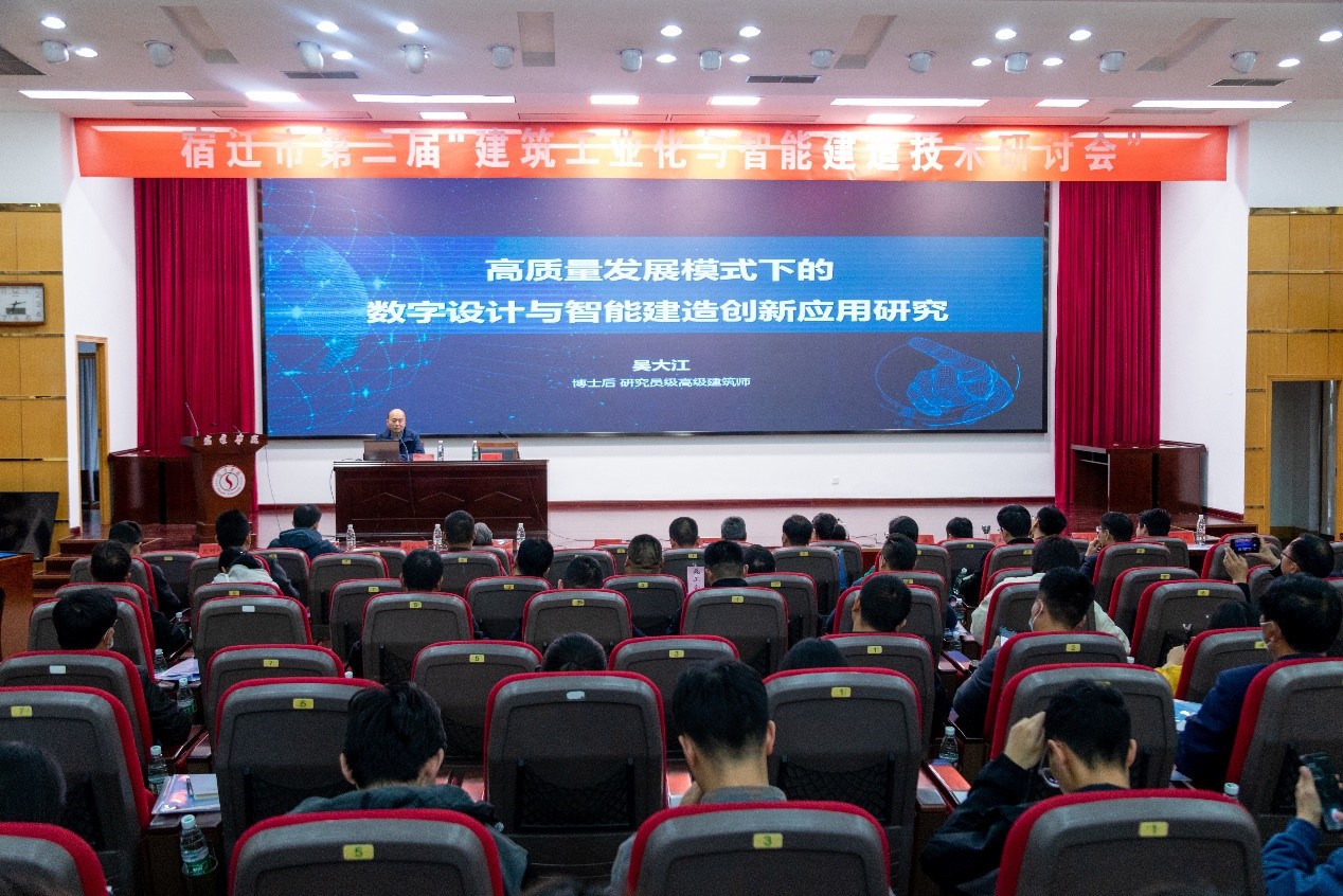 宿迁市科学技术协会副主席朱虎在讲话中指出物联网、大数据、人工智能等新兴技术在工程建设中快速应用,加速了建筑工业化与智能建造融合发展,实现对建筑建造全过程各阶段、各要素进行系统集成化和资源优化,有利于实现工程建设高效益、高质量和低消耗、低排放,对推动绿色低碳发展,助力实现碳达峰碳中和目标具有重要的现实意义。