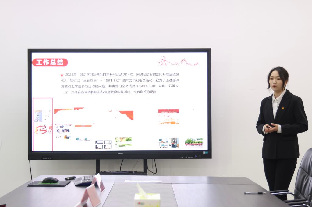 大会上各组织负责人紧紧围绕组织工作履职情况、工作成效与亮点、存在问题、未来工作规划等内容进行述职,结合自身所学与工作实际谈体会、谈收获,表示在2024年将不断总结教训、积累经验,认真落实“全心全意为同学服务”的宗旨,不忘初心、砥砺前行。会议最后由学院党委委员倪春艳作总结讲话,她充分肯定各组织负责人在过去一年中所做出的积极贡献,对各组织负责人提出以下要求:一要讲好建工故事,善于将组织工作与学校工作紧密结合;二要提前规划好学期亮点工作,从不同角度审视问题,增加团队凝聚力;三要加强组织管理,强化责任分工,齐心协力为学校的发展贡献青春力量。