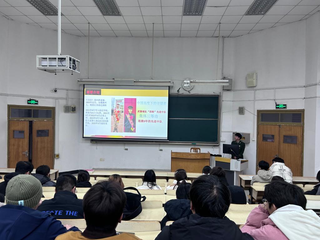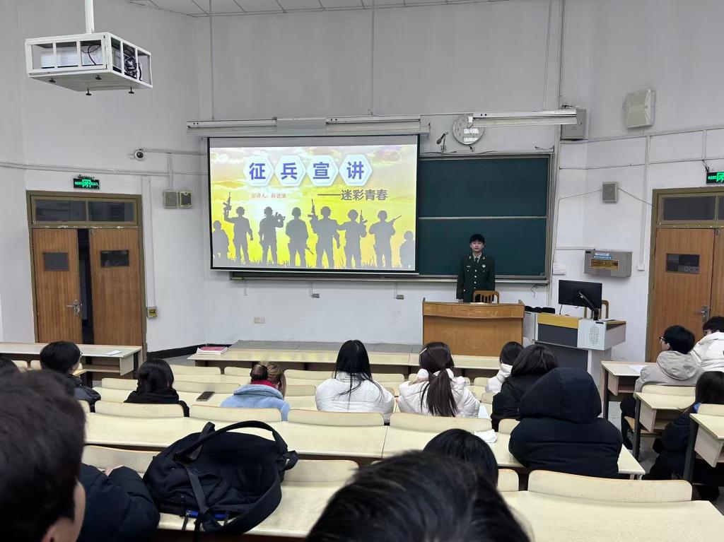 薛健康同学结合自身军营经历,深情分享了在部队的训练磨砺、生活点滴与成长蜕变,生动展现了新时代青年军人的责任与担当。他以“过来人”的视角,聚焦2026年春季征兵的核心条件、报名流程、优待政策细则、学业衔接保障及军旅长远发展等学子关切的热点问题,进行了全面细致、极具感染力的解读,为在场同学清晰勾勒出军旅成长蓝图。真诚的分享、鲜活的事例有效点燃了学子们的从军热情,宣讲会结束后,多名同学主动围拢咨询报名相关事宜,现场氛围热烈。