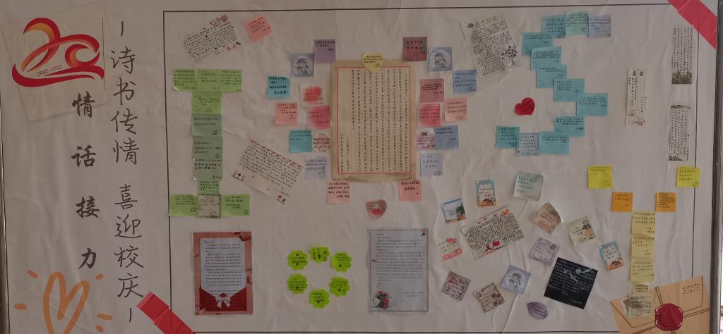 本次爱校接力活动寄托于运动,寓情于纸笔,以跑步、情话接力、写情书等方式体现了同学们的爱校情怀。在这短短10天,校园多个角落都有着同学们青春的身影,有的同学以运动传播情怀,利用跑步软件,在学校各个地方跑出“20”“爱心”等与宿院20周年有关的字样,用青春昂扬、积极向上的方式向宿院送出祝福。有的同学以纸笔诉说深情,用词句传递祝福,在便利贴上写下了自己对宿院20周年校庆的祝福,张张便利贴上言真意切的展现了同学们对宿院20周年的深深祝福。还有同学们在信纸、贺卡等上面写下了一封封装饰精美的情书,用真挚的话语表达了自己对宿院未来的无限期待和美好祝愿。