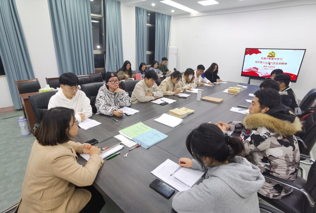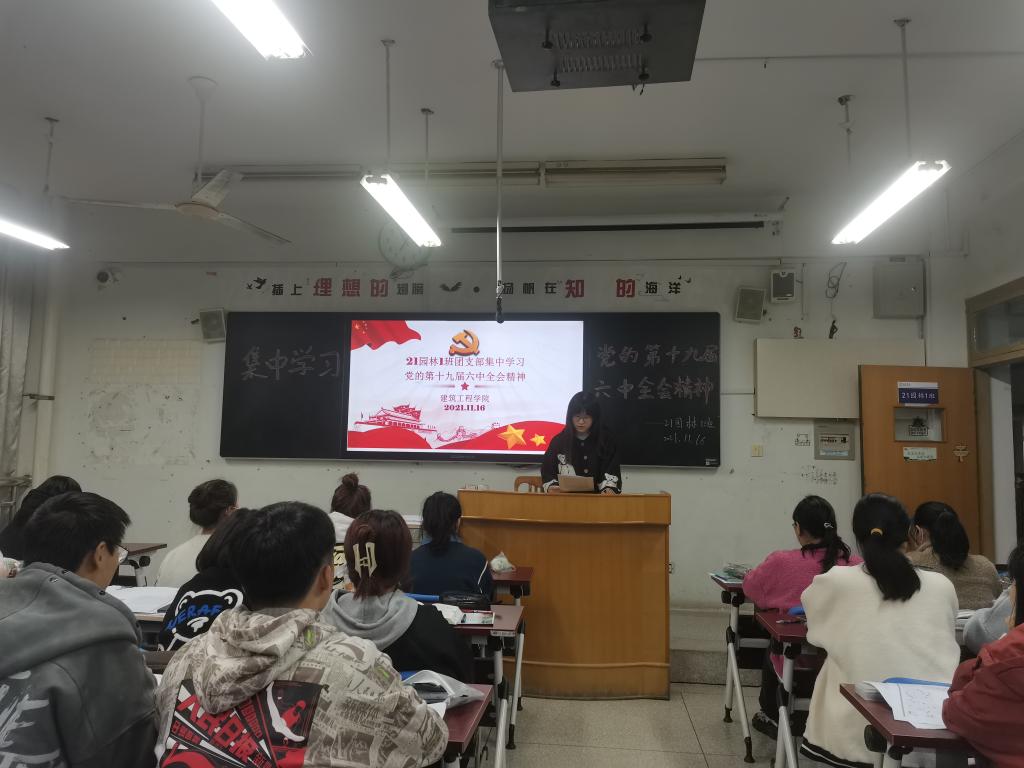 2021年11月16日下午,建筑工程学院组织团学干部在E209集中学习了党的十九届六中全会精神,团总支书记王倩老师领学。