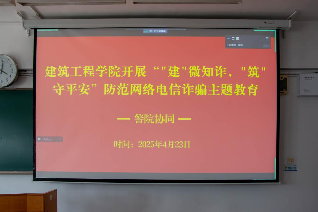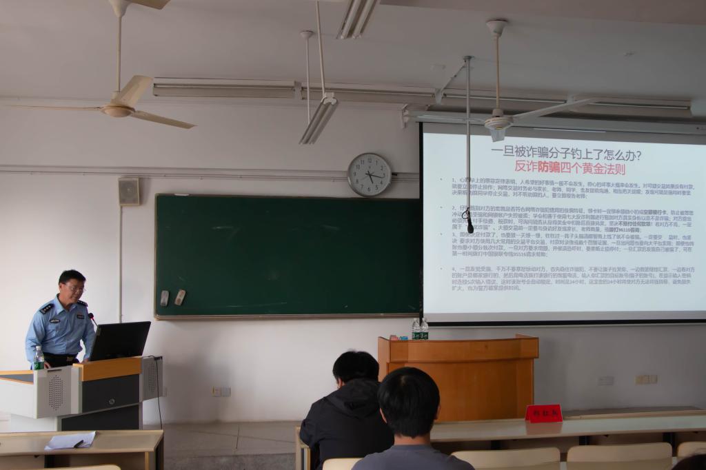 为筑牢校园防诈安全网,建筑工程学院于2025年4月23日在4-306(主会场)及4-301(分会场)举办“‘建微知诈,筑守平安’”反诈主题宣讲会。活动特邀宿迁市公安局警务专员一级警长、宿迁学院保卫处副处长(挂职)郑红兵主讲,200余名学生反诈宣传员参与。