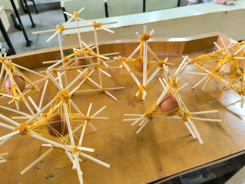 学生分组行动,利用一次性筷子搭建缓冲结构。他们奇思妙想,有的组将筷子搭建成三角支架,有的组则把筷子编织成网状护笼,大家都争分夺秒,只为给生鸡蛋打造坚固的“防摔盔甲”。这些“千奇百怪”的装置,中间都稳稳包裹着一颗鸡蛋。别看它们模样奇特,每一个可都藏着同学们的精巧心思,是大家智慧与创意的结晶。