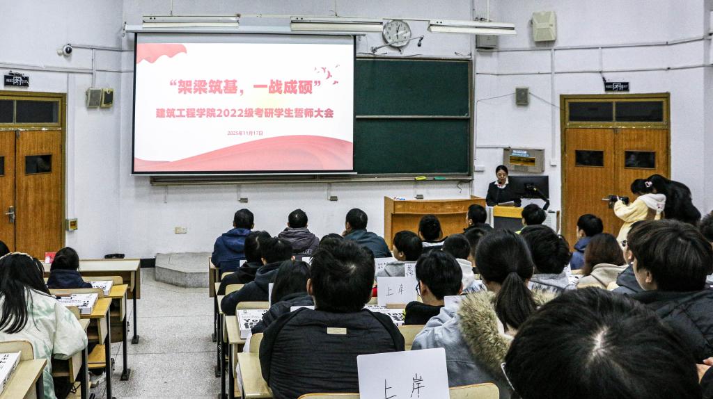 2025年11月17日,恰逢国际大学生节,为更好地帮助学院2022级考研学子提升考研信心、舒缓考研压力、鼓舞学生士气,建筑工程学院于晚上6点在4212教室开展2022级考研冲刺誓师大会。学院教学工作负责人、土木工程系主任郭璐老师、系主任、2022级班主任代表、全体辅导员和考研学子参会。