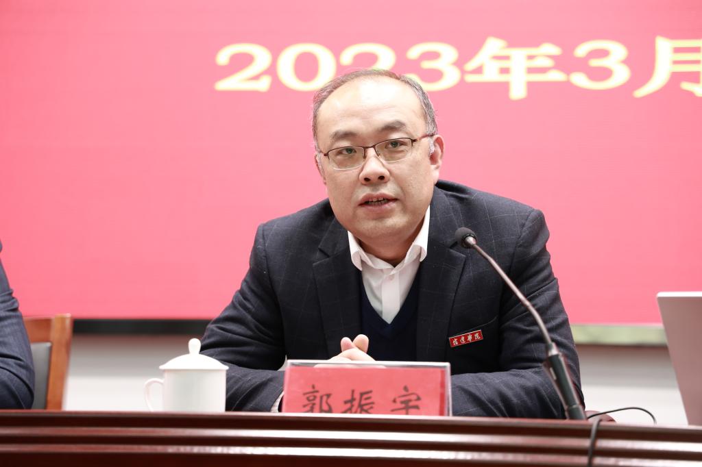 院党委书记郭振宇在讲话中指出,一是“2022年一起熬过”,他回顾了2022年学校在疫情背景下,保障疫情安全的情况下,学校、学院的管理工作不断推进,教学工作不断发展。二是“2023年一起面对”,他强调要锚定“三高目标”,聚力“四大突破”,为学校、学院的发展建设努力,同时强调各专业发展以及教学管理,要求各位老师对教学目标以及实现途径有所规划。三是“展望未来,我们一起前行”,对此,他分析了今后教育发展形势,对未来的发展进行规划展望,要求各部门做好目标规划,各老师做好个人发展规划,并明确实施步骤。