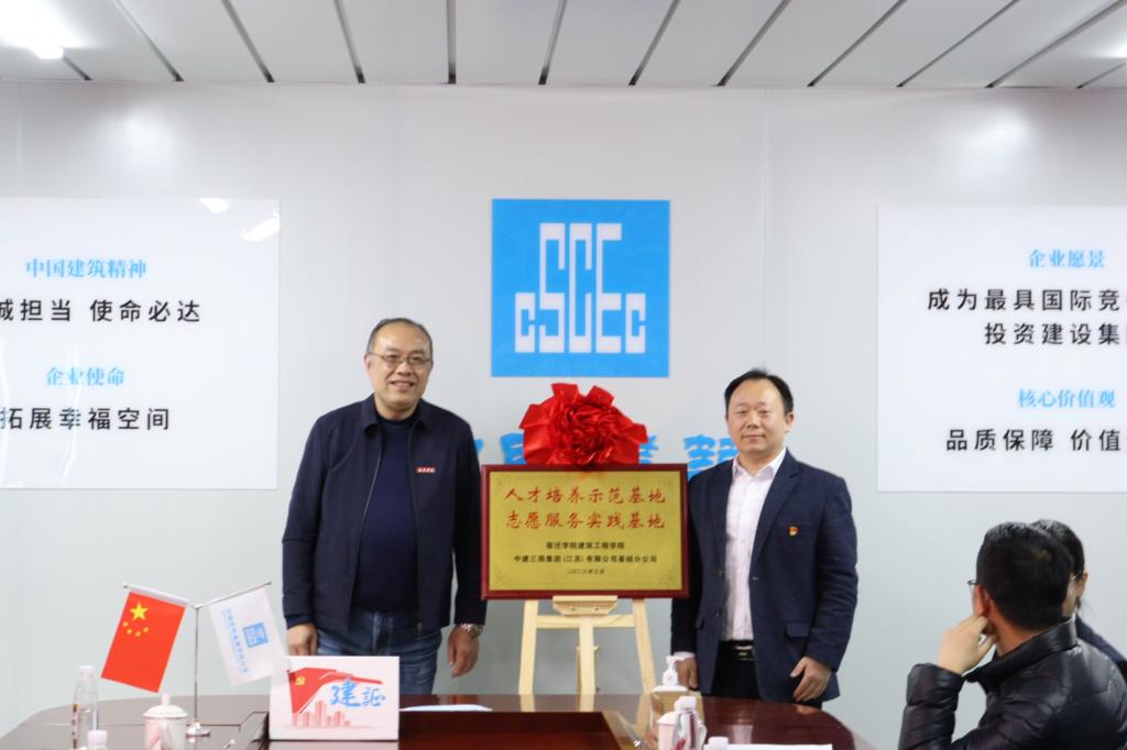 活动以中建三局宿迁学院新校区东北校区项目建设为载体,双方围绕青年博士志愿服务、人才实践能力培养、智能建造技术应用和施工管理节能减排等方面展开了深入交流。项目总工程师殷雄就新校区所采用的智慧工地指挥平台、智慧巡检系统、无人施工升降机、智能门禁系统等智能建造技术进行了交流;党员教师盛超结合自身专业和工程实际,从节水、节材、降碳、施工组织管理四个方面提出节能降碳建议。随后,开展了“人才培养示范基地”“志愿服务实践基地”的揭牌仪式、对宿迁学院铁军班学生赠书活动。