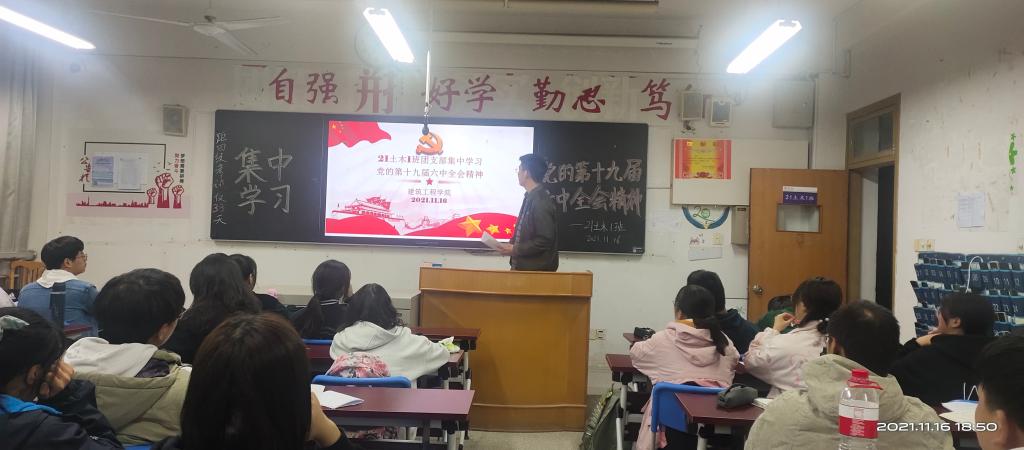 2021年11月16日下午,建筑工程学院组织团学干部在E209集中学习了党的十九届六中全会精神,团总支书记王倩老师领学。